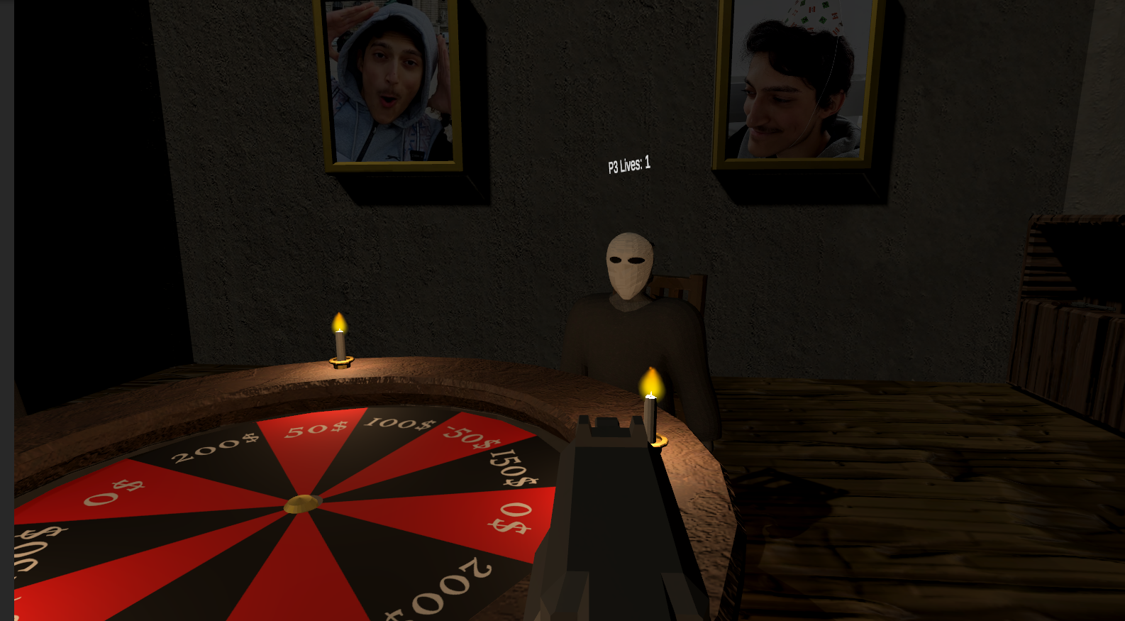 Russisches Roulette, 3 echte Spieler spielen miteinander. Man darf entscheiden ob man den Spieler oder sich selber abschießen möchte. Schießt man sich selber ab und es wird eine blank geschoßen, dann darf man einmal den wheel am Tisch spinnen. Man bekommt geld oder verliert geld. Mit geld kannst du im Shop sachen kaufen um die überlebenschancen zu erhöhen.