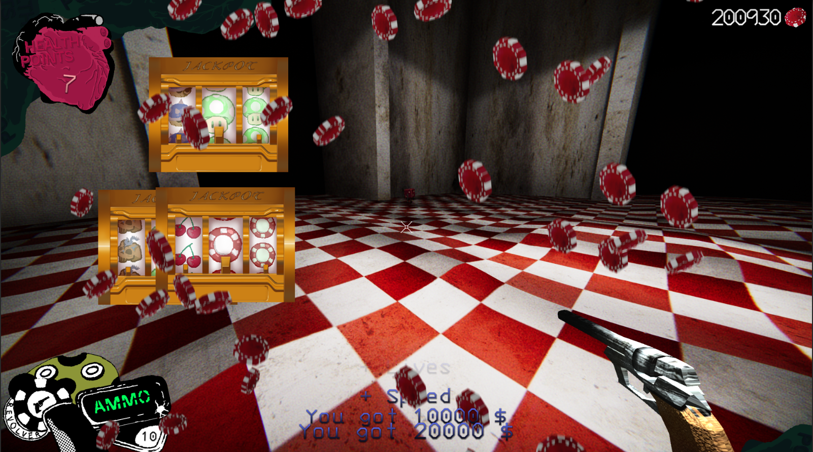 WASD- Steuerung, Shift- Schneller, LMB- Schießen, E- Interagieren mit Slotmachines, Space- Springen