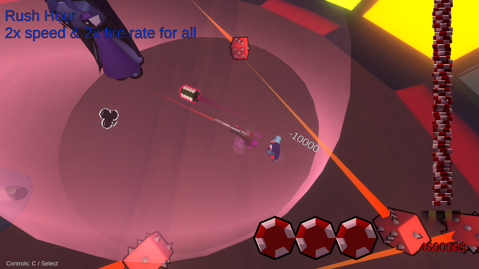 Man befindet sich in einem riesigen Roulette-Rad und muss gegen Waves von Gegnern kämpfen.