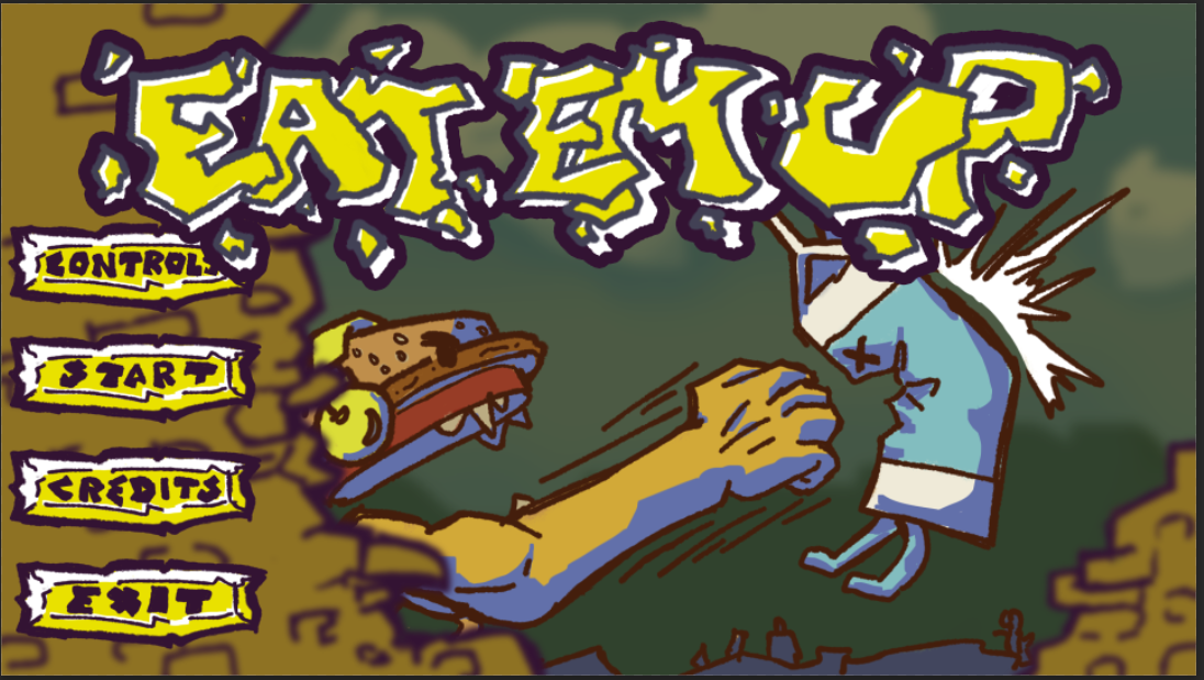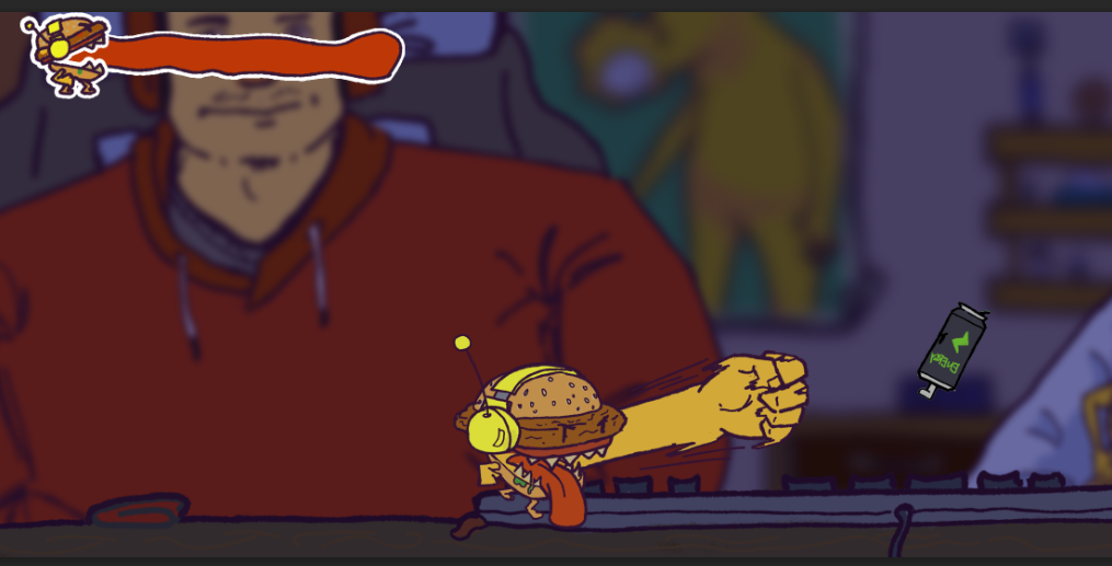 Beat 'em up, where you play as a burger, that has to fight various food items. You are constantly hungry so if you don't eat for long enough, you die. You can also instead choose to get a Power-Up, when you defeat an enemy.
