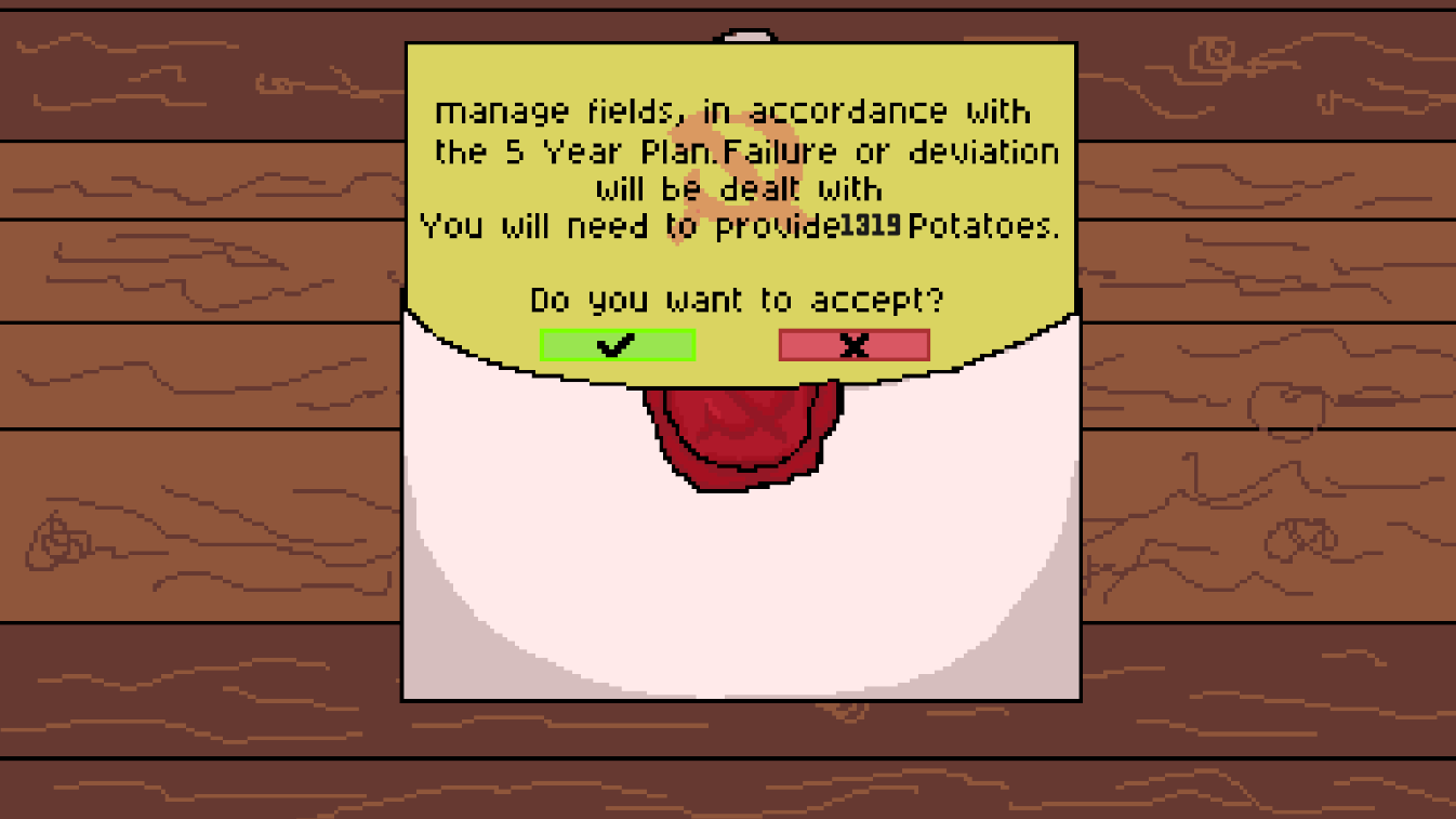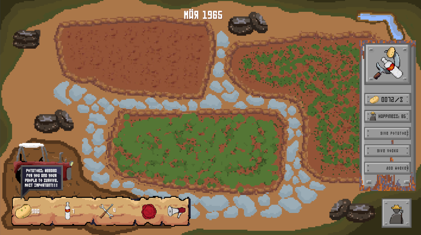 Glory-to-the-seed is a resource management game about production quotas, administrative pressure, and hunger. This means the player can“t move around. They are a soviet manager and sit in their office and manage the regions by making decisions like what resources to allocate to what region and depending on the resources they get at the beginning of each new year what problems (modifiers) to fix and which to leave. Regions consume a random amount of food.